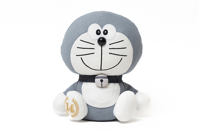 開館14周年記念のデニムドラえもんは、シンプルなライトグレー!首輪やしっぽは黒で統一し、上品な印象に仕上げました。