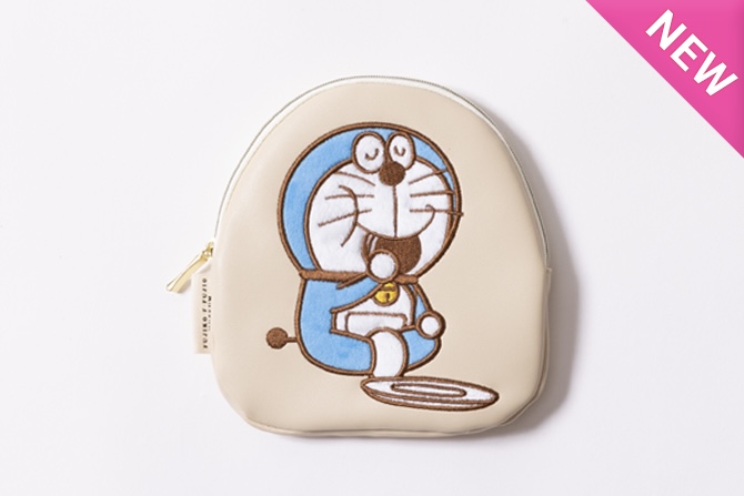 汚れに強いPUレザーのポーチにボア刺繡が施されています。おいしそうにどら焼きをほおばるドラえもんがとってもキュート!開口部が大きくので、物の出し入れもスムーズです。